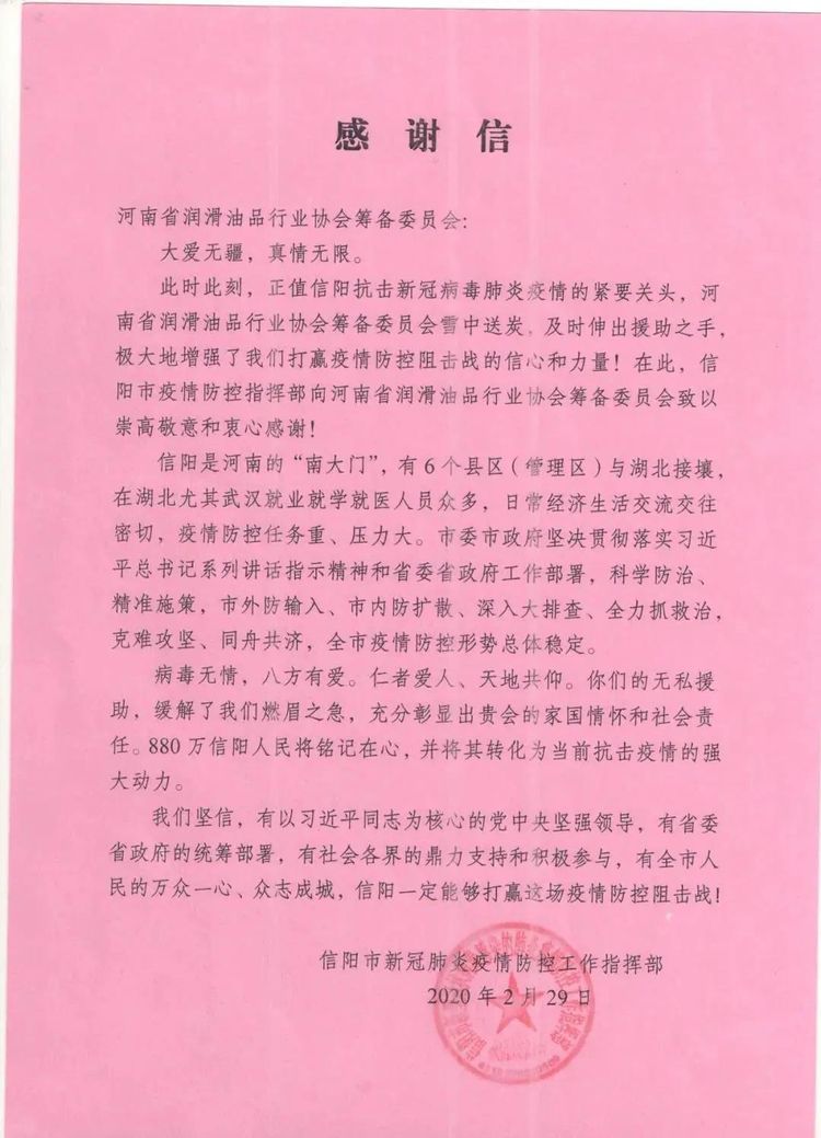 新冠肺炎疫情發生以來,河南三元科技能源有限公司在河南省潤滑油品行業協會的組織下,還積極參與了行業協會開展的系列疫情抗擊服務工作,彰顯了企業的社會責任與擔當!